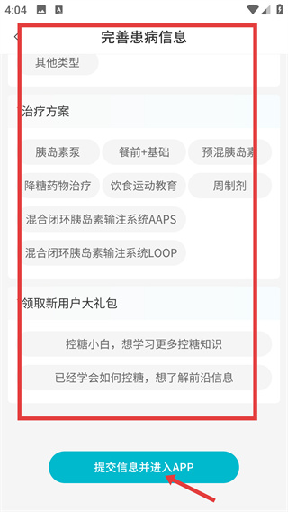 4、在【完善患病信息】頁面,填寫對應(yīng)的信息后,點(diǎn)擊【提交信息并進(jìn)入APP】按鈕,進(jìn)入應(yīng)用。