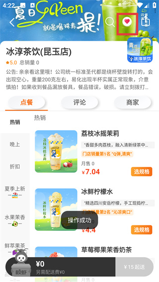 4、點(diǎn)擊收藏按鈕后,頁(yè)面出現(xiàn)圖標(biāo)變成紅心以及“操作成功”的提示,代表已成功將該商家添加至收藏列表。