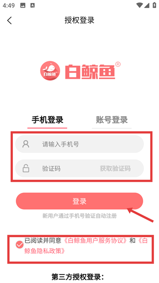 1、在【白鯨魚】授權(quán)登錄頁面選擇手機登錄,輸入手機號、獲取并填寫驗證碼,勾選協(xié)議后點擊【登錄】按鈕完成登錄。