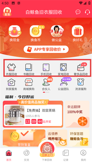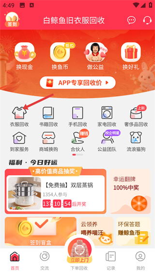 2、登錄后進入【白鯨魚舊衣服回收】首頁,可查看衣服回收、書籍回收等各類回收服務(wù)選項。
