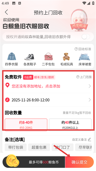 4、在預約上門回收頁面,補充地址、選擇取件時間與回收數(shù)量后,點擊【確認提交】完成上門回收預約。