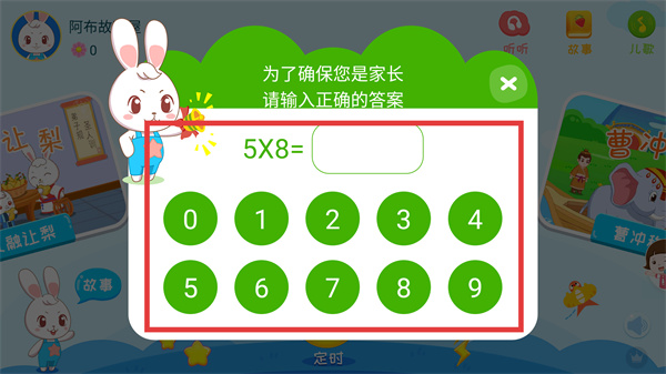 1、在阿布故事屋首頁點擊“定時”按鈕,觸發(fā)家長身份驗證的彈窗流程。