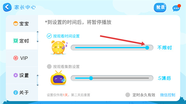 3、在家長中心的定時設(shè)置頁面,找到“按觀看時間設(shè)置”對應(yīng)的時長滑塊,準備調(diào)整播放時長。