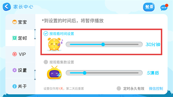 4、拖動“按觀看時間設(shè)置”的滑塊,將播放時長調(diào)整為30分鐘,完成內(nèi)容播放的定時配置。