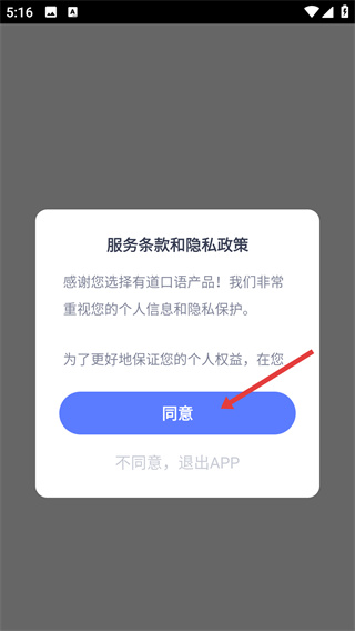 1、在有道口語的服務(wù)條款和隱私政策彈窗中,點(diǎn)擊“同意”按鈕,進(jìn)入應(yīng)用的后續(xù)操作流程。