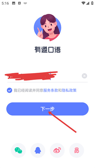 2、在有道口語的登錄頁面,輸入手機(jī)號(hào)碼,確認(rèn)已勾選協(xié)議后,點(diǎn)擊“下一步”按鈕,進(jìn)入驗(yàn)證碼輸入的環(huán)節(jié)。