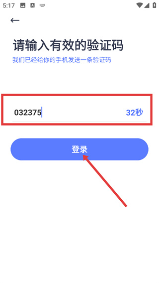 3、在驗(yàn)證碼輸入頁面,填寫收到的驗(yàn)證碼,點(diǎn)擊“登錄”按鈕完成賬號(hào)注冊(cè)的登錄操作。