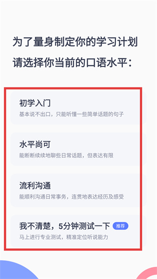 4、登錄后進(jìn)入口語水平選擇頁面,根據(jù)自身情況選定對(duì)應(yīng)的口語水平,進(jìn)入主頁面。