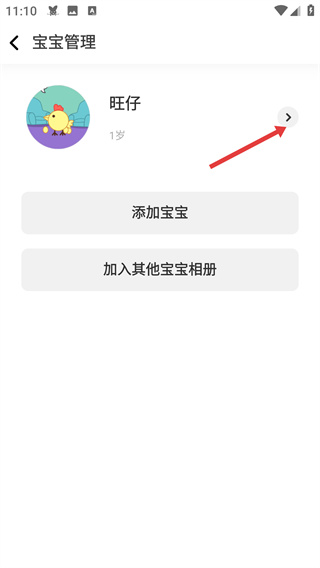 2、在寶寶管理頁(yè)面找到條目旁的箭頭按鈕,點(diǎn)擊該按鈕進(jìn)入寶寶信息頁(yè)面,查看家人列表及邀請(qǐng)選項(xiàng)。