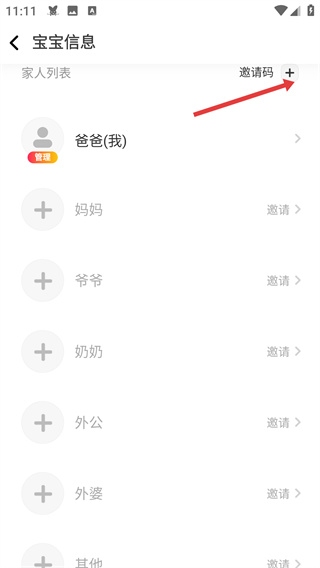 3、在寶寶信息頁(yè)面點(diǎn)擊右上角的【+按鈕】,進(jìn)入邀請(qǐng)家人頁(yè)面,可生成并分享邀請(qǐng)碼邀請(qǐng)家人加入。