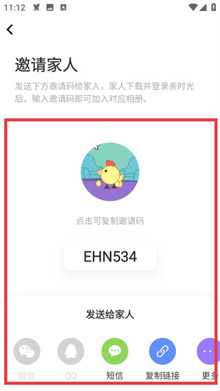 4、在邀請(qǐng)家人頁(yè)面點(diǎn)擊可復(fù)制邀請(qǐng)碼,隨后選擇對(duì)應(yīng)方式將邀請(qǐng)碼發(fā)送給家人,邀請(qǐng)其加入相冊(cè)。