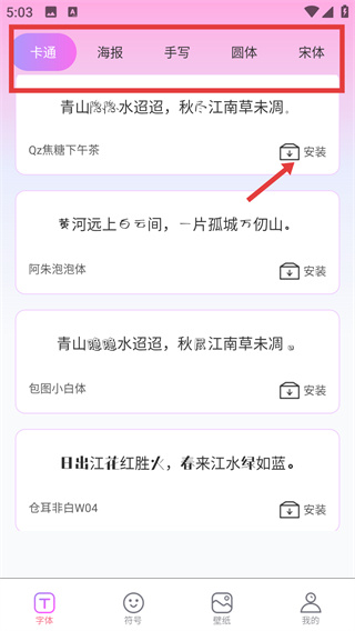 1、在主頁面可以選擇各種分類,點擊目標字體旁的安裝按鈕,觸發(fā)“解鎖此字體”的操作彈窗。