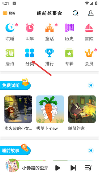 1、在“睡前故事會”頁面點擊【分類】按鈕,進入全部分類界面,可按內(nèi)容類型篩選故事。