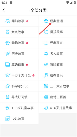 2、在全部分類中選擇【經(jīng)典童話】分類,進入對應故事列表頁面。