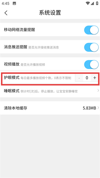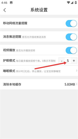 4、點(diǎn)擊【護(hù)眼模式】的【+】按鈕,將每日最多播放視頻個(gè)數(shù)調(diào)整為對(duì)應(yīng)數(shù)量,完成設(shè)置。