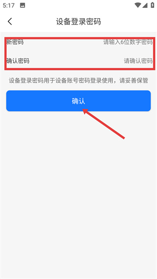 4、在設備登錄密碼頁面,依次輸入6位數(shù)字的【新密碼】與【確認密碼】,點擊【確認】完成密碼設置。
