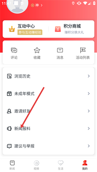 2、在個人頁面中找到“新聞報料”選項并點擊,進入“我的報料”管理頁面。