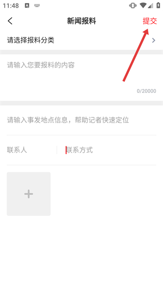 4、在新聞報料界面依次填寫報料分類、內(nèi)容、事發(fā)地點、聯(lián)系人等信息后,點擊“提交”按鈕完成報料操作。