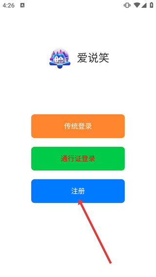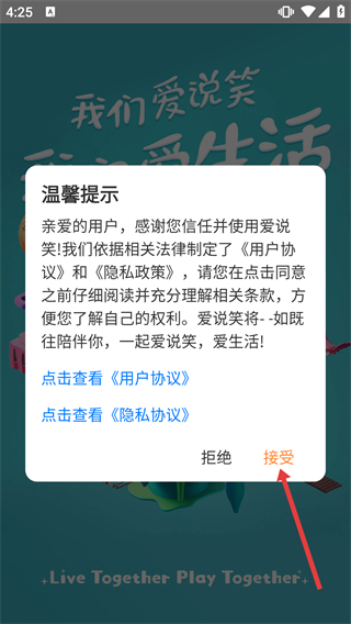 1、在“溫馨提示”彈窗中點(diǎn)擊“接受”按鈕,進(jìn)入愛說笑的登錄注冊選擇頁面。