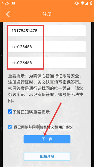 3、在注冊頁面填寫手機(jī)號、密碼等信息,勾選“了解已知曉重要提示”“我已閱讀并同意協(xié)議”后,點(diǎn)擊“下一步”按鈕。