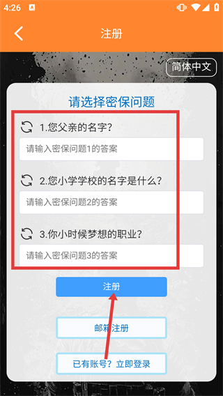 4、在密保問題選擇頁面,選定密保問題并填寫對應(yīng)答案,點(diǎn)擊“注冊”按鈕,完成賬號注冊操作。