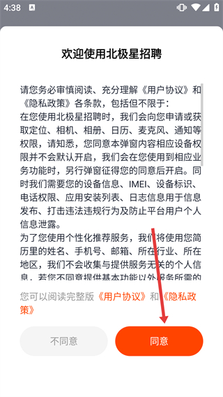 1、在“歡迎使用北極星招聘”的協(xié)議彈窗中,點擊“同意”按鈕,進入招聘推薦主頁面。