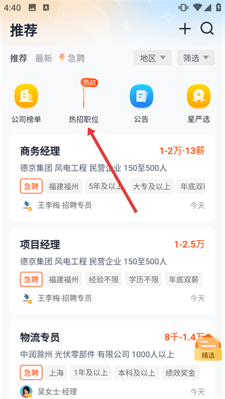 2、在推薦主頁面點擊“熱招職位”選項,進入熱招職位的列表展示頁面。