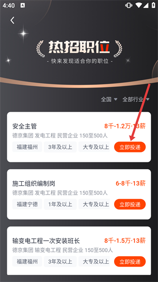 3、在熱招職位頁面選定目標(biāo)職位(如“安全主管”),點擊職位旁的“立即投遞”按鈕,觸發(fā)賬號登錄的驗證流程。