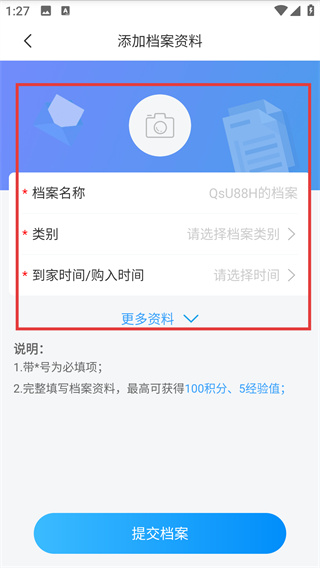 3、在添加檔案資料頁面,按要求填寫檔案名稱、選擇檔案類別、設(shè)置到家時(shí)間/購入時(shí)間等必填信息。