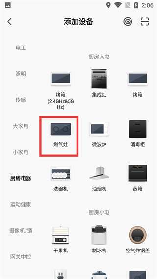 2、進入添加設(shè)備頁,在廚房電器分類中找到并選擇【燃氣灶】,進入該設(shè)備的配置流程。