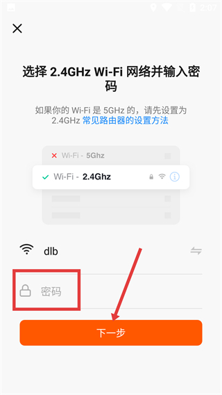 3、選擇對應(yīng)【2.4GHz-Wi-Fi】網(wǎng)絡(luò),在密碼輸入框填寫WiFi密碼后,點擊【下一步】推進配網(wǎng)。