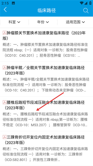 2、在臨床路徑頁(yè)面選擇【腰椎后路短節(jié)段減壓融合術(shù)加速康復(fù)臨床路徑(2023年版)】條目,進(jìn)入詳情頁(yè)。