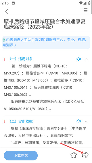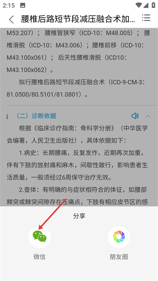 3、在該臨床路徑詳情頁(yè)點(diǎn)擊分享按鈕,打開(kāi)分享選項(xiàng)菜單,可將專(zhuān)業(yè)醫(yī)療路徑內(nèi)容分享至外部渠道。
