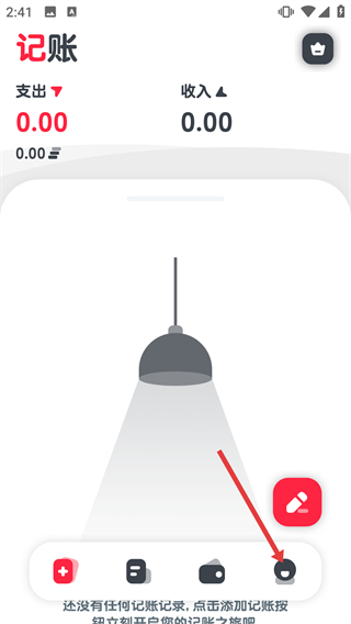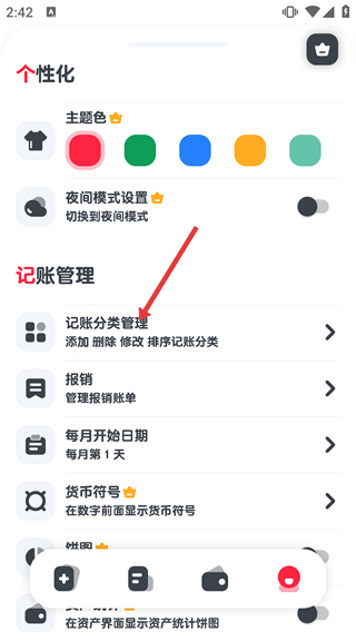 1、在記賬應(yīng)用首頁,點擊底部對應(yīng)的功能按鈕,進(jìn)入包含個性化設(shè)置與記賬管理的操作頁面。
