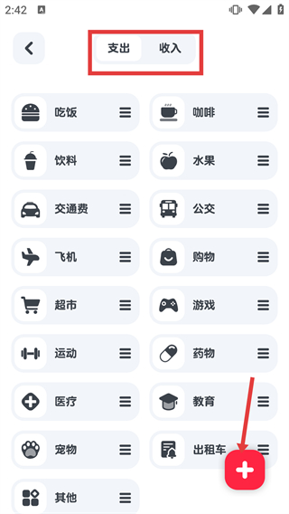 3、在分類管理的“支出”標(biāo)簽頁下,點擊右下角的紅色加號按鈕,進(jìn)入新分類的創(chuàng)建頁面。