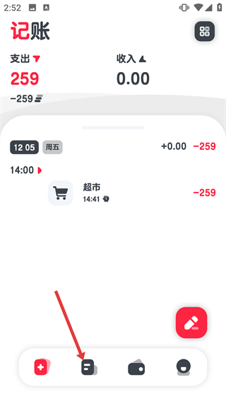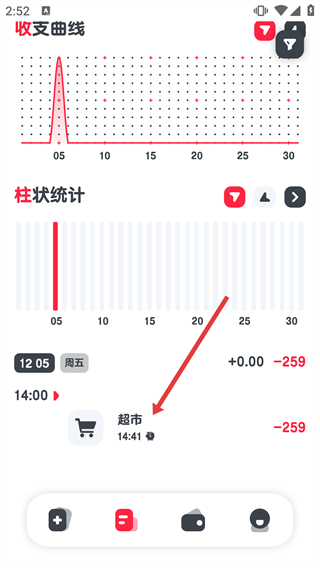 1、在記賬應(yīng)用首頁,點(diǎn)擊底部對應(yīng)的功能按鈕,進(jìn)入包含收支曲線、柱狀統(tǒng)計(jì)的數(shù)據(jù)分析頁面。