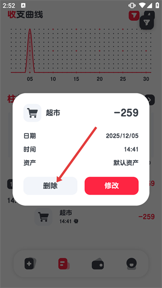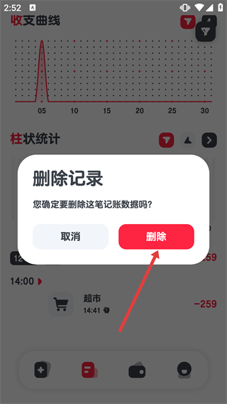 4、在刪除記錄的確認(rèn)彈窗里,點(diǎn)擊【刪除】按鈕,完成該筆記賬記錄的刪除操作。