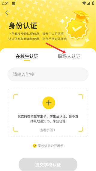 3、在身份認(rèn)證頁面點(diǎn)擊【職場(chǎng)人認(rèn)證】選項(xiàng),切換至對(duì)應(yīng)的認(rèn)證表單,該表單適配職場(chǎng)用戶的認(rèn)證需求。