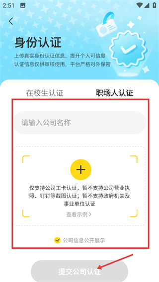4、在職業(yè)人認(rèn)證頁面填寫公司名稱、上傳工卡等信息后,點(diǎn)擊【提交公司認(rèn)證】按鈕完成職場(chǎng)身份認(rèn)證。