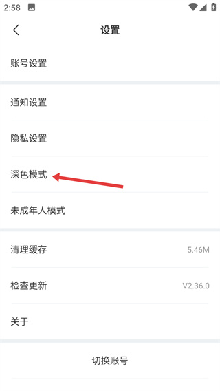 3、在設(shè)置頁(yè)面點(diǎn)擊【深色模式】選項(xiàng),進(jìn)入對(duì)應(yīng)設(shè)置頁(yè)面,可調(diào)整應(yīng)用的顯示模式樣式。