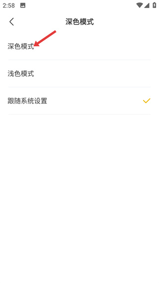 4、在深色模式頁(yè)面選擇【深色模式】選項(xiàng),完成應(yīng)用顯示模式向深色樣式的切換操作。