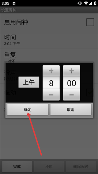 2、在時(shí)間選擇彈窗內(nèi),調(diào)整目標(biāo)小時(shí)、分鐘及時(shí)段(上午/下午),設(shè)置完成后點(diǎn)擊“確定”按鈕。