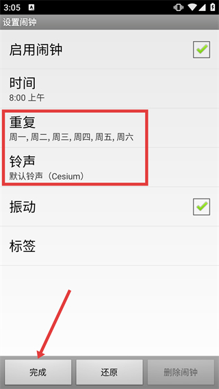 3、進(jìn)入鬧鐘詳細(xì)設(shè)置頁(yè),配置重復(fù)周期、鈴聲等參數(shù)后,點(diǎn)擊“完成”按鈕保存該鬧鐘的設(shè)置。