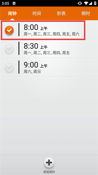 4、返回鬧鐘主界面,可在列表中查看新增的鬧鐘,該鬧鐘已生效并顯示對(duì)應(yīng)的配置信息。