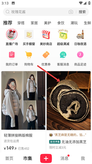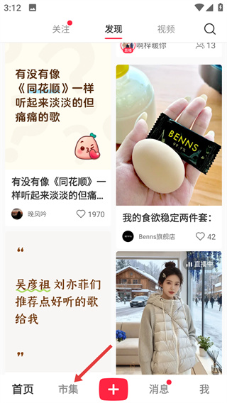 1、在發(fā)現頁面點擊底部【市集】選項,進入市集購物頁面,該頁面提供各類商品的展示與購買入口。