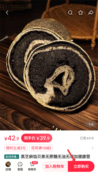 2、在市集頁面點擊【黑芝麻餡貝果】商品條目,進入該商品的詳情頁面,查看價格、優(yōu)惠等信息。