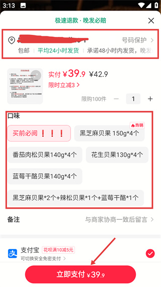 4、在訂單確認頁面選擇收貨地址、目標商品規(guī)格后,點擊【立即支付】按鈕,完成該商品的購買支付流程。