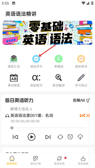 1、在“我的首頁”點擊【語法學(xué)習(xí)】選項,進(jìn)入英語語法課程列表頁面,該模塊提供不同難度的語法學(xué)習(xí)課程入口。