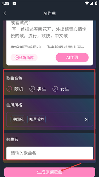 4、在作曲頁面選擇歌曲音色、曲風風格,輸入歌曲名后點擊【生成原創(chuàng)歌曲】,完成歌曲創(chuàng)作。