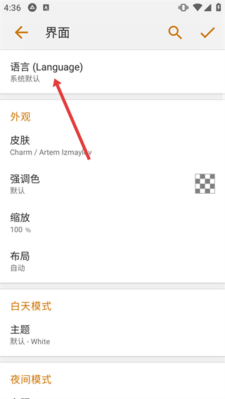 4、在界面設(shè)置頁(yè)面中,找到“語(yǔ)言”選項(xiàng),可對(duì)應(yīng)用的語(yǔ)言顯示進(jìn)行調(diào)整設(shè)置。